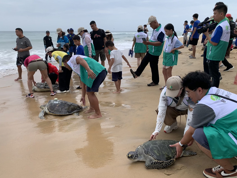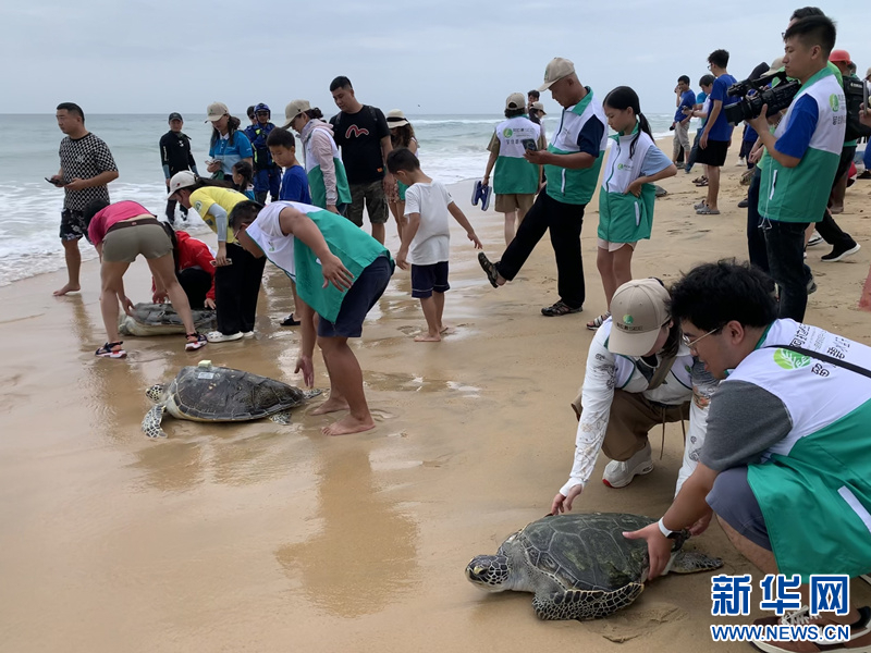 相关部门、爱心企业代表和环保公益组织代表等100余人在海南陵水海域将10只救治康复的海龟以及5万尾鱼苗放归大海。