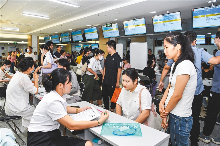 8月18日,2023年海口市“职引未来 筑梦青春”百日千万招聘专项活动第二场招聘会在海口市人力资源市场举办,吸引众多求职者前来应聘。