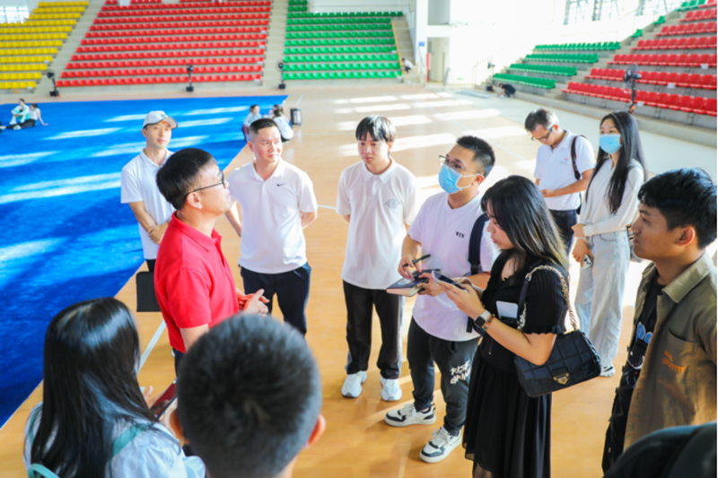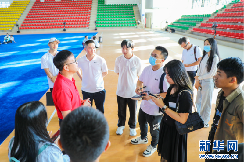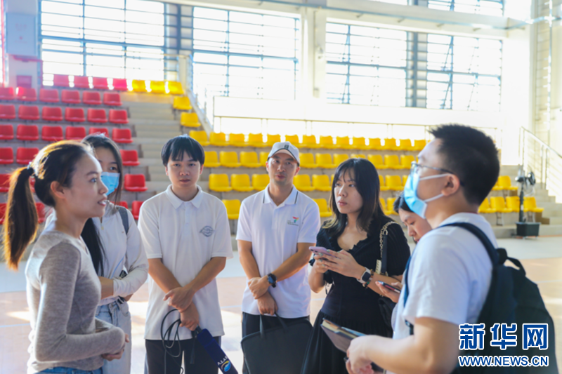 媒体记者探访三亚市第一中学体育馆,采访场馆相关负责人。新华网发(牛良玉 摄)