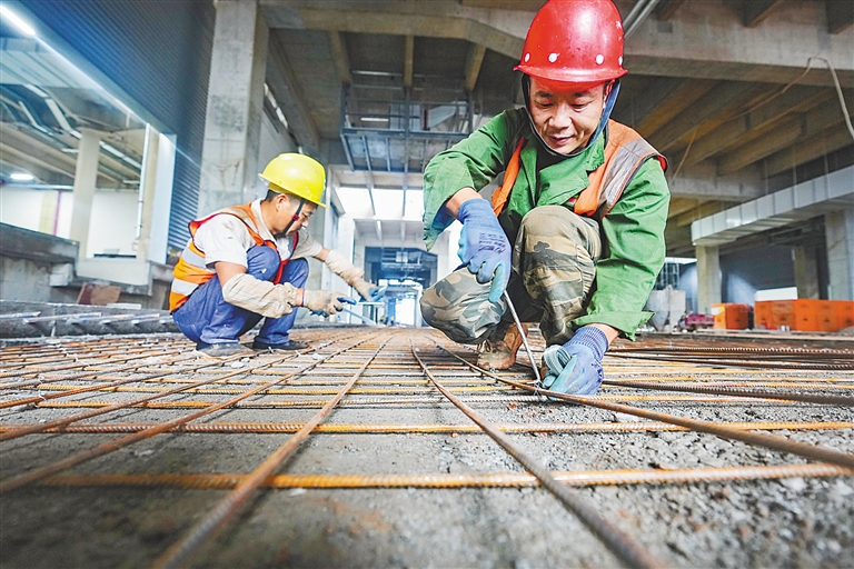10月28日,位于海口国家高新区的深国际·海口智慧供应链基地项目施工现场,工作人员正在进行室外雨污水管道、室外道路和室内设备安装等施工。
