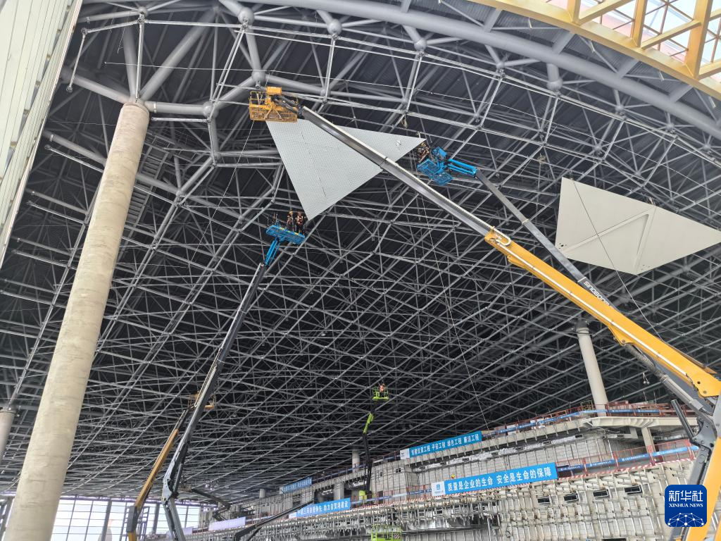 工人正在对T3航站楼进行室内装饰装修。(中建三局供图)