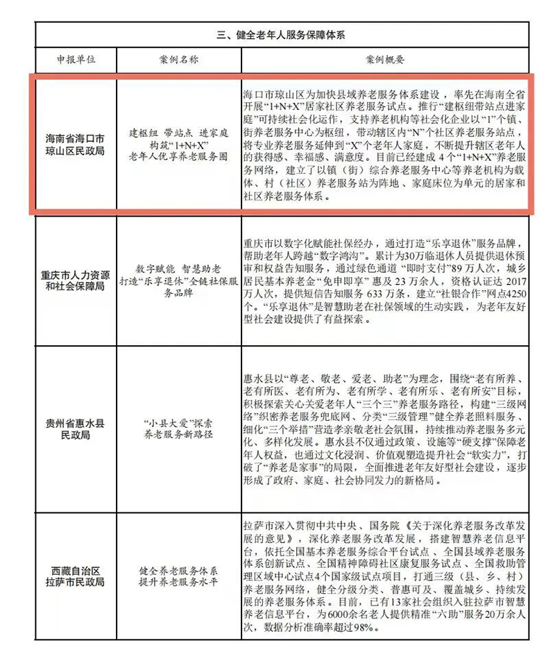 近日,全国老龄工作委员会办公室发布2025年老年友好型社会建设典型案例通知,公布全国共94个入选的典型案例。其中,海南省海口市琼山区民政局申报的《建枢纽 带站点 进家庭构筑“1+N+X”老年人优享养老服务圈》案例凭借创新模式与显著成效成功入选,为全国老年友好型社会建设提供了可复制的实践经验。