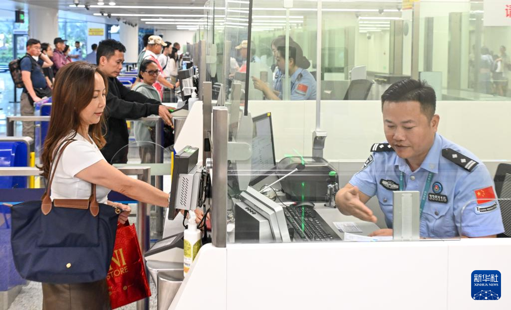 10月15日,入境旅客在海口美兰边检站办理边检手续。新华社记者 杨冠宇 摄