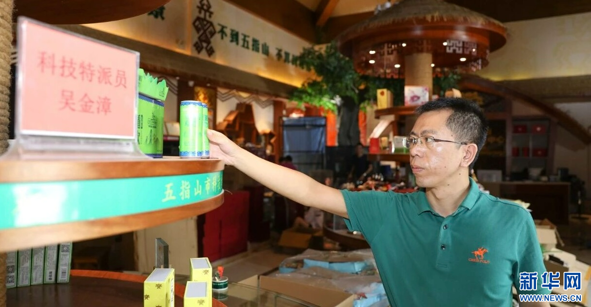 五指山水满乡种植养殖农民专业合作社理事长吴金漳在整理茶叶产品。新华网发