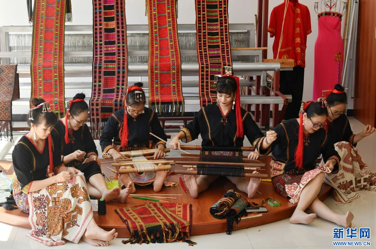 张潮瑛(左四)和村民一起编织黎锦。新华网发