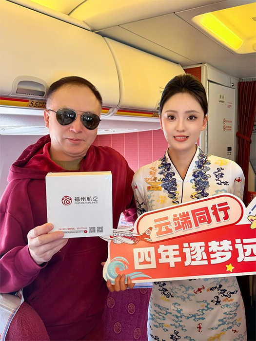 此次航班由荣获2024年“全国工人先锋号”的福州航空“茉莉”乘务示范组执飞。活动中,“福州航空知识有奖竞猜”环节点燃客舱气氛,引发旅客踊跃参与。3名幸运旅客获赠定制机模,并与“全国工人先锋号”机组人员合影。