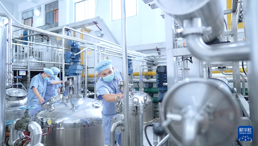 海南华研海口生产基地的生物多肽生产车间内,工人正在操作自主设备进行鱼胶原蛋白肽生产。(邢堂 摄)