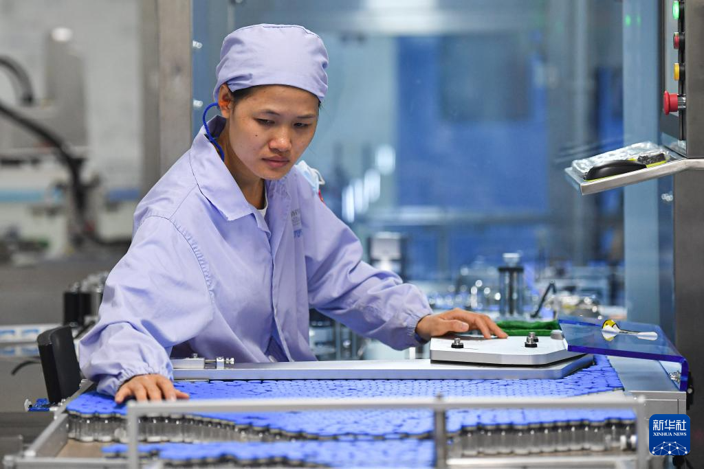 在海南自贸港重点园区——海口国家高新技术产业开发区药谷工业园,药企工人在车间生产药品(2021年6月17日摄)。新华社记者 蒲晓旭 摄
