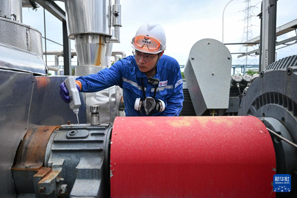 在海南自贸港重点园区——东方临港产业园内,中海油富岛(海南)化工有限公司的工人对丙烯腈联合装置开展巡检(11月7日摄)。新华社记者 蒲晓旭 摄