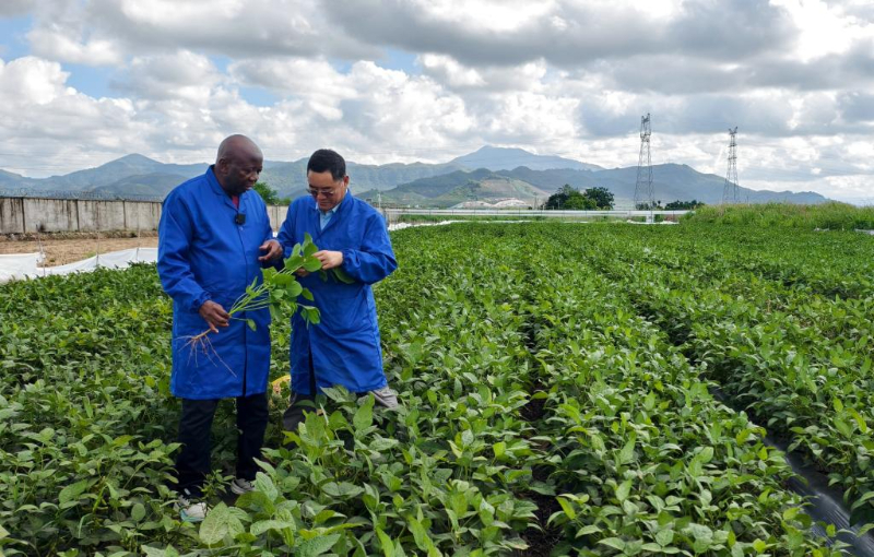非洲科学院院士菲利克斯·达帕雷·达科拉(左)在中国农业科学院国家南繁研究院实验基地查看大豆生长情况(6月6日摄)。新华社发