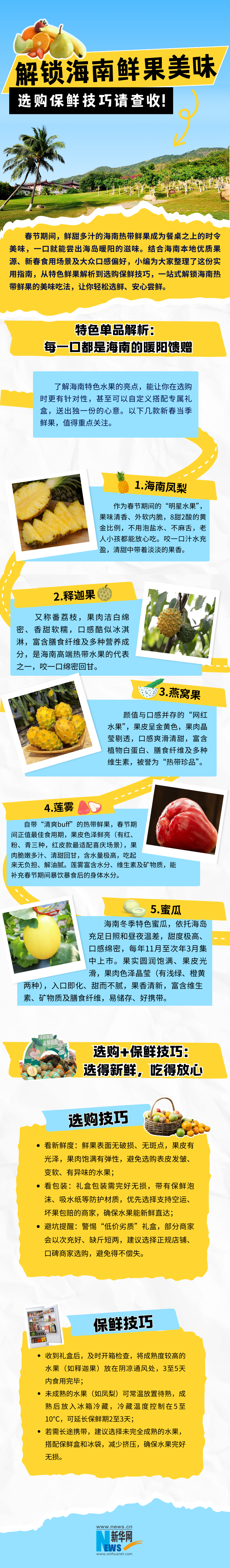 春节期间,海南热带水果不仅成为全国人民餐桌上的一道鲜味,也成为人们探亲访友随身携带的伴手礼之一。春节在海南,怎样挑选本地优质热带水果?若长途携带,如何保鲜?小编整理了一份选购保鲜技巧指南,请您查收!