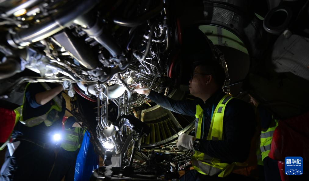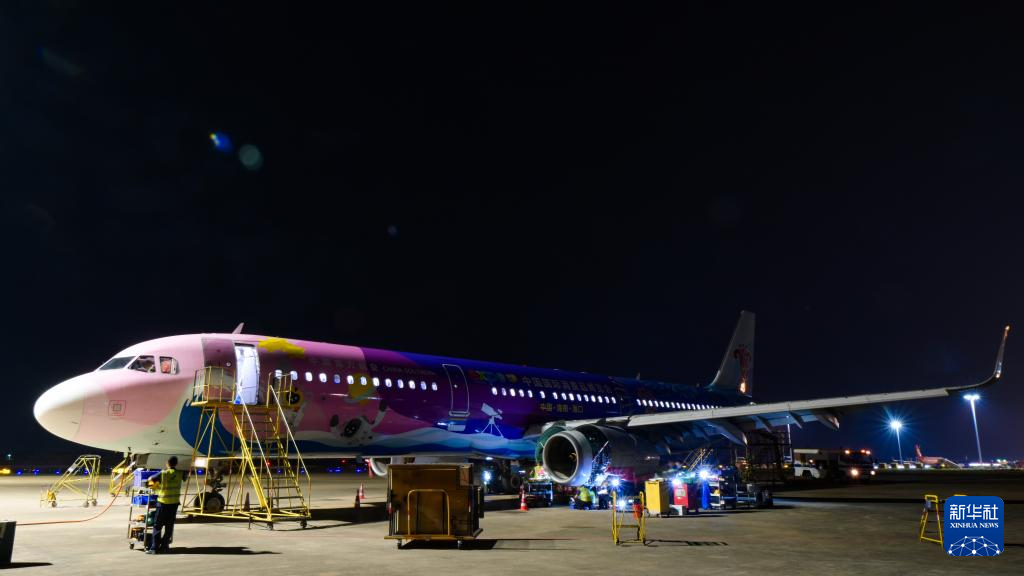 在海口美兰国际机场停机坪上,南航工程技术分公司机务工程师对“消博号”彩绘飞机进行深度检查(4月4日摄)。新华社记者 杨冠宇 摄