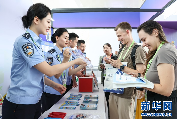 海口边检总站民警为外籍参展人员宣介12367服务平台和移民管理政策。新华网发(孙浩戎 摄)