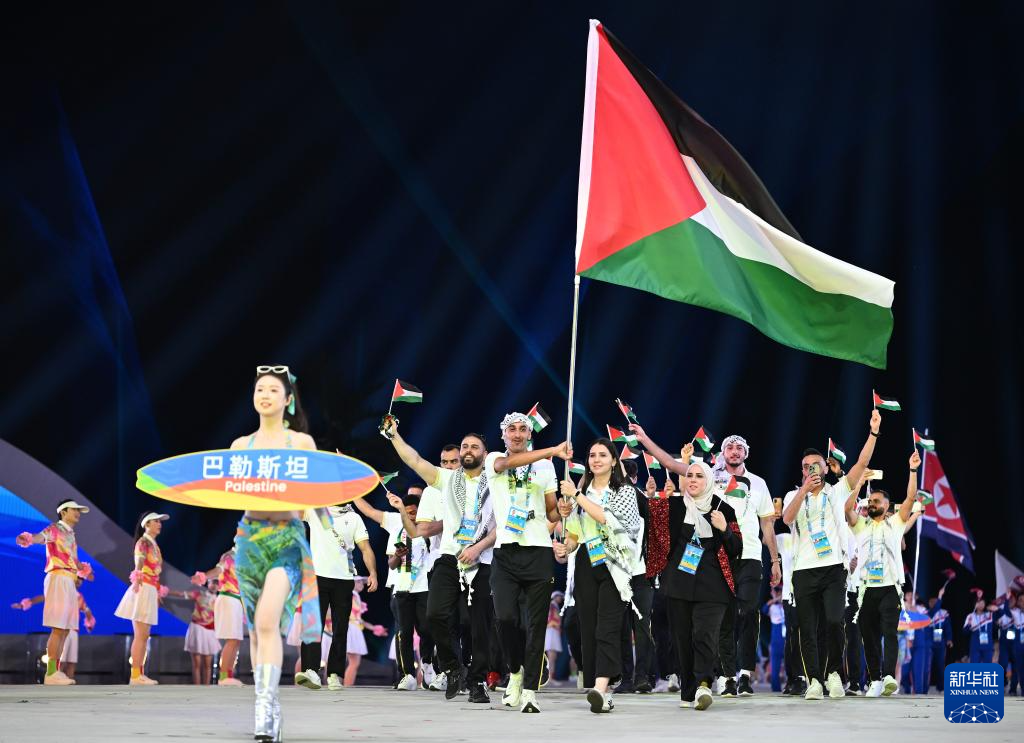 4月22日,巴勒斯坦体育代表团在开幕式上入场。新华社记者 赵子硕 摄