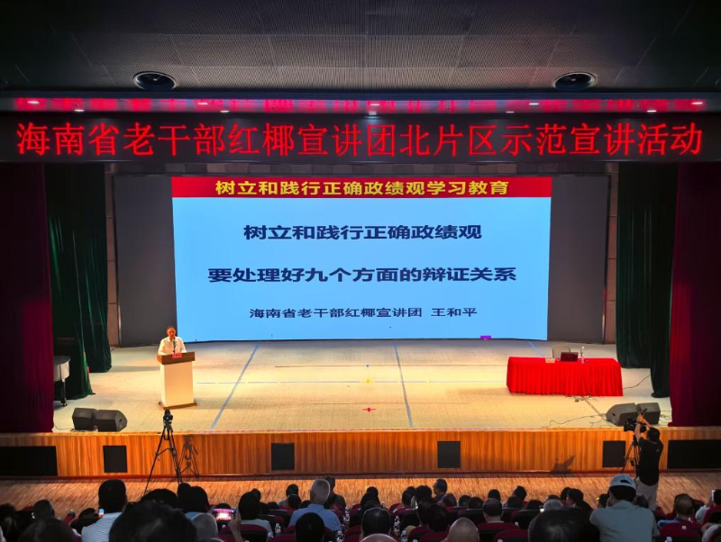 海南省老干部红椰宣讲团副团长、省委党校原常务副校长王和平作题为《树立和践行正确政绩观 要处理好九个方面的辩证关系》的宣讲。他从“稳”与“进”、“破”与“立”等九个方面,系统阐述正确政绩观的辩证逻辑,强调树立和践行正确政绩观关乎立党为公、执政为民,需不断提升辩证思维能力,把握各项矛盾关系的统一。