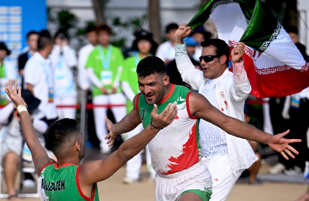 新华社三亚4月27日电(记者丁文娴、胡佳丽)在27日进行的第六届亚沙会沙滩卡巴迪男子决赛中,伊朗队44:31击败印度队,以全胜战绩夺冠。赛后队员们展开两面国旗,高举着绕场庆祝,而后又把国旗铺在地上跪地亲吻。