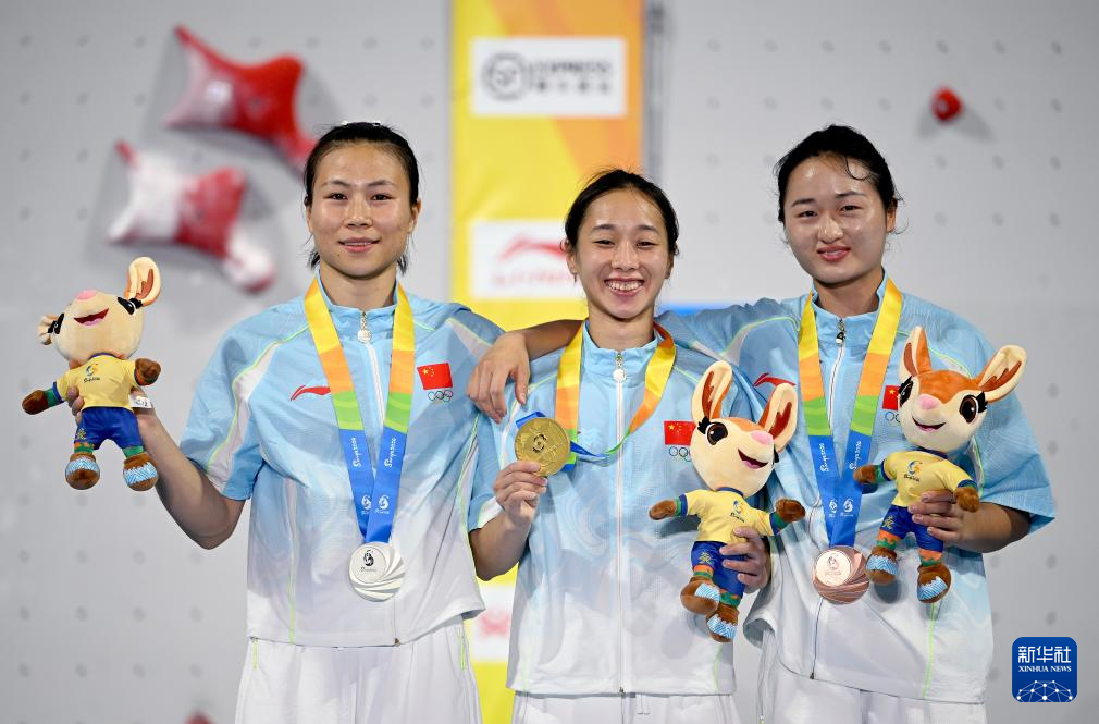 4月28日,冠军中国选手周娅菲(中)、亚军中国选手邓丽娟(左)和季军中国选手张少琴在颁奖仪式上。新华社记者 赵子硕 摄