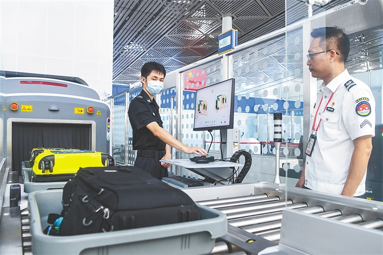 “一次过检、无感通关”就是旅客在申报柜台办理托运,行李进入托运CT安检设备检查,CT机的屏幕上可以清晰显示行李内物品的3D立体图像,通过“一机双屏”功能,建立了安检与海关融合查验模式,实现查验设备资源共享,达到“一机双屏”的效果,让旅客只需一次安检,就能在后台完成安检和海关两道查验。海南日报记者 袁琛 摄