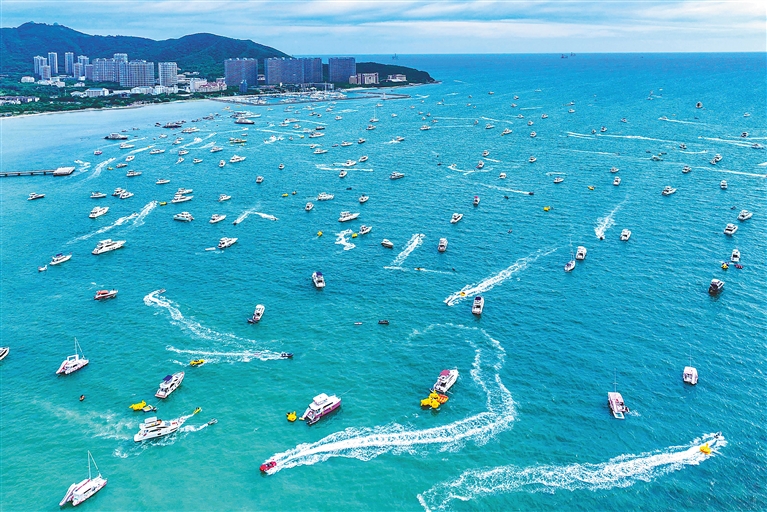 近日,在三亚湾海域,众多游客乘坐游艇驰骋海面,体验亲水运动。