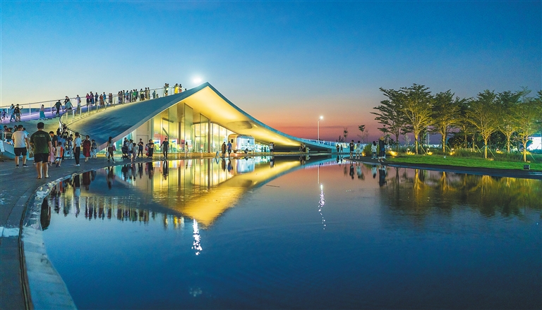 10月1日,天气晴好,市民游客来到海口天空之山驿站观赏海口湾落日美景。海南日报记者 宋国强 摄