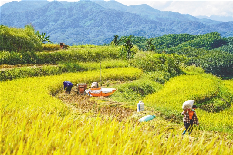 近日,五指山市牙胡梯田迎来了丰收季。层层叠叠的金色稻浪在微风中摇曳,三三两两的农户忙碌在梯田中,脸上洋溢着丰收的喜悦。今年以来,在五指山市政府扶持下,当地村民逐渐走上了农旅融合的道路,村集体有了旅游巴士,村民有了旅游收入,梯田的丰收景色尽情展现着乡村振兴的美好图景。海南日报通讯员 傅金城 摄
