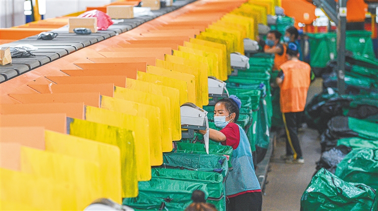日前,在中国邮政集团有限公司海口邮区中心,工作人员正在智能分拣流水作业线上忙碌。