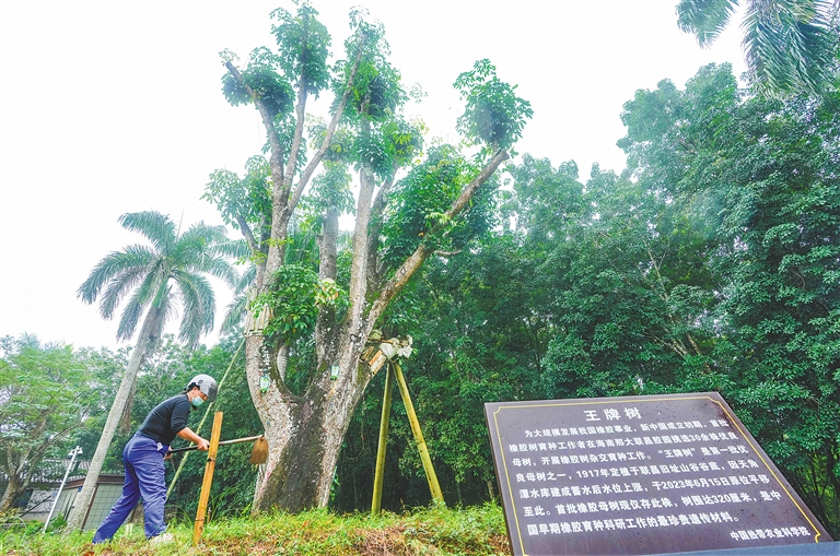 近日,在儋州市的中国热带农业科学院联昌试验站旧址,工作人员在给搬进新家的“百年橡胶王”古树除草,树冠上已经萌发不少新叶。该棵古树树龄106岁,今年6月因海南天角潭水利枢纽项目库区蓄水移植至“新家”,开始新生。海南日报记者 陈元才 摄
