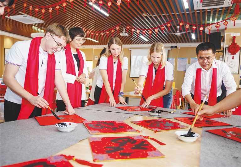 2月7日,海南软件职业技术学院举办外国留学生新春茶话会,组织留学生写春联、剪窗花、包饺子,为留学生送去新春祝福、冬日温暖。图为留学生在书法老师的指导下,练习写“福”字。