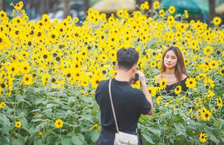 3月14日,海口万绿园盛开的向日葵引来市民游客拍照留念。据了解,万绿园种植的向日葵约有3500株,向日葵种苗于去年12月种下,现在正处于盛花期,花期持续到3月底。海南日报记者 李天平 摄