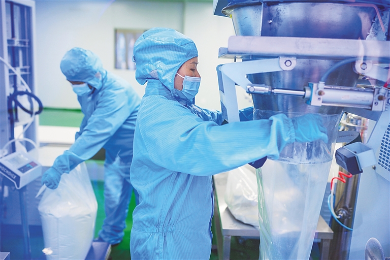 近日,海口国家高新区美安科技新城,海南华研胶原科技股份有限公司包装车间的工人们正加紧订单生产,打包胶原蛋白肽粉外销。