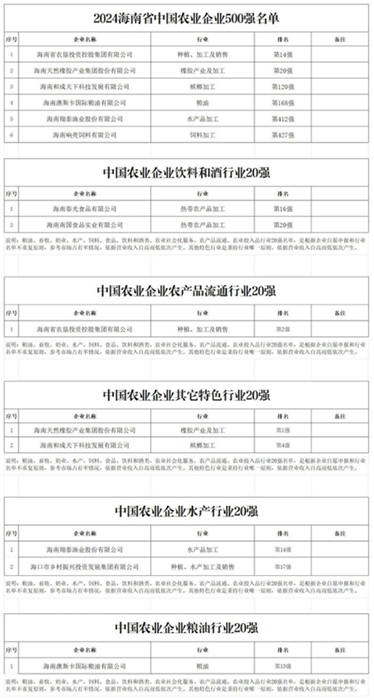 2024年12月20日,农民日报社发布了《2024中国农业企业500强》。海南省有6家企业上榜500强,较2023年新增3家企业,分别为:海南省农垦投资控股集团有限公司、海南天然橡胶产业集团股份有限公司、海南和成天下科技发展有限公司、海南澳斯卡国际粮油有限公司、海南翔泰渔业股份有限公司、海南响亮饲料有限公司。另外,海南省有8家企业入选中国农业企业饮料和酒、农产品流通、水产、粮油、其他特色行业20强,较去年新增7家企业,海南省农业企业影响力显著增强。