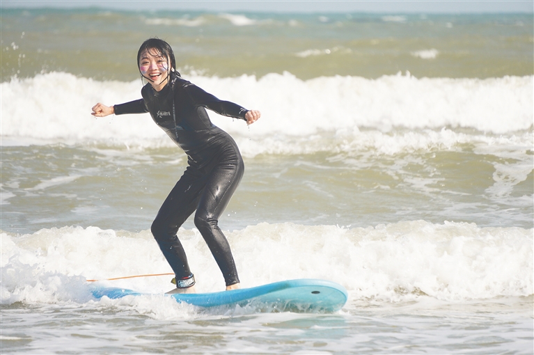 迫不及待想要与大海“亲密接触”的一雯在当地朋友的介绍下,“转场”至日月湾,加入了冲浪俱乐部,成为下海逐浪的一员。“海里冲浪什么感觉?”“刺激!”一雯的回答毫不犹豫。
