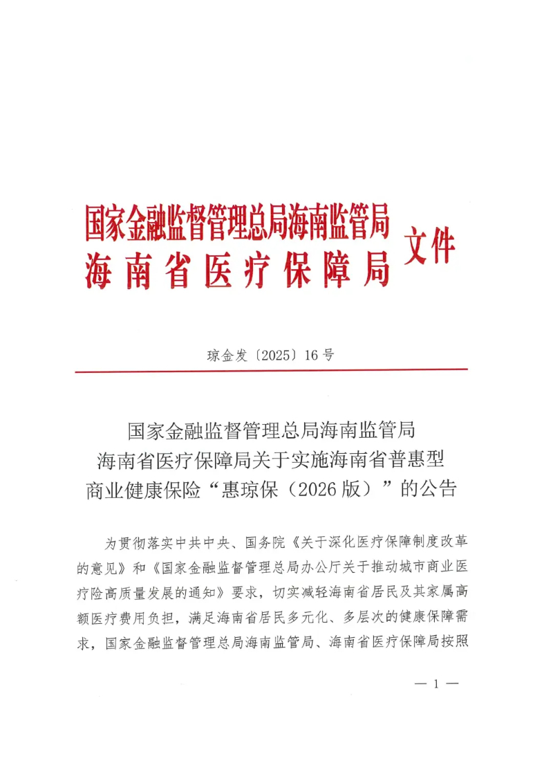 近日,国家金融监督管理总局海南监管局、海南省医疗保障局联合发布《关于实施海南省普惠型商业健康保险“惠琼保(2026版)”的公告》,旨在让更多海南人民知晓并参保 “惠琼保”2026版,切实享受到这份惠民保障福利。