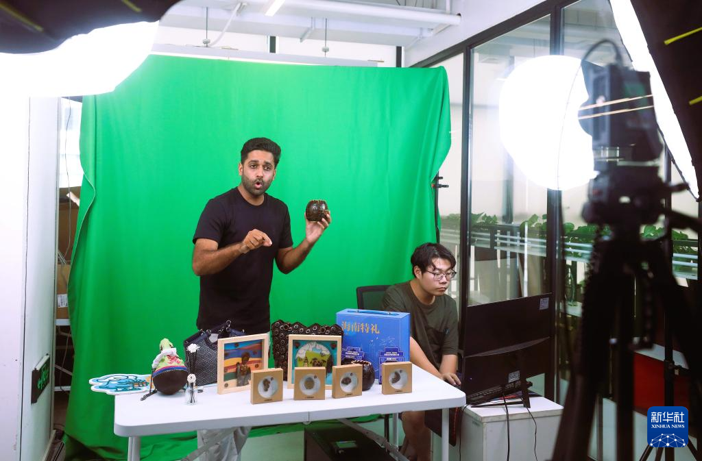 9月22日,在海南省海口市复兴城互联网信息产业园,一名来自巴基斯坦的主播在直播间进行直播带货。新华社记者 郑悦 摄