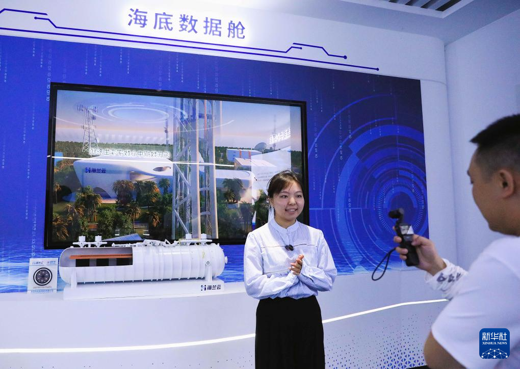 9月25日,一名记者在介绍海南海底数据中心的海底数据舱模型。