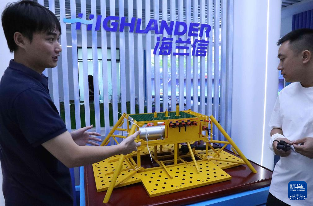 9月25日,工作人员(左)为参观者介绍海南海底数据中心海底观测网主接驳盒模型。新华社记者 郑悦 摄