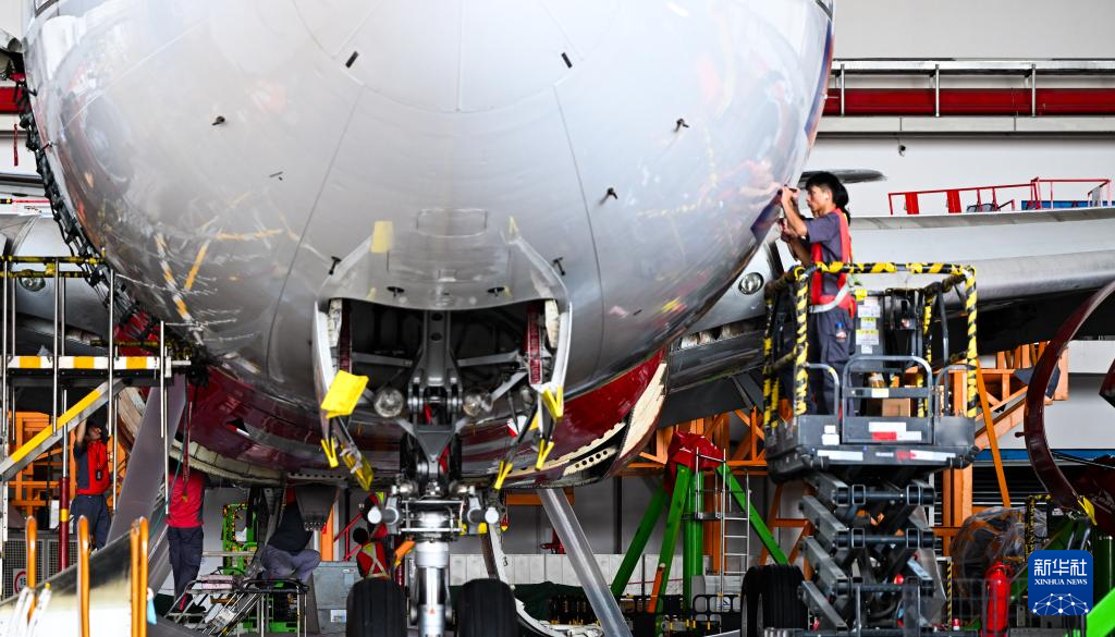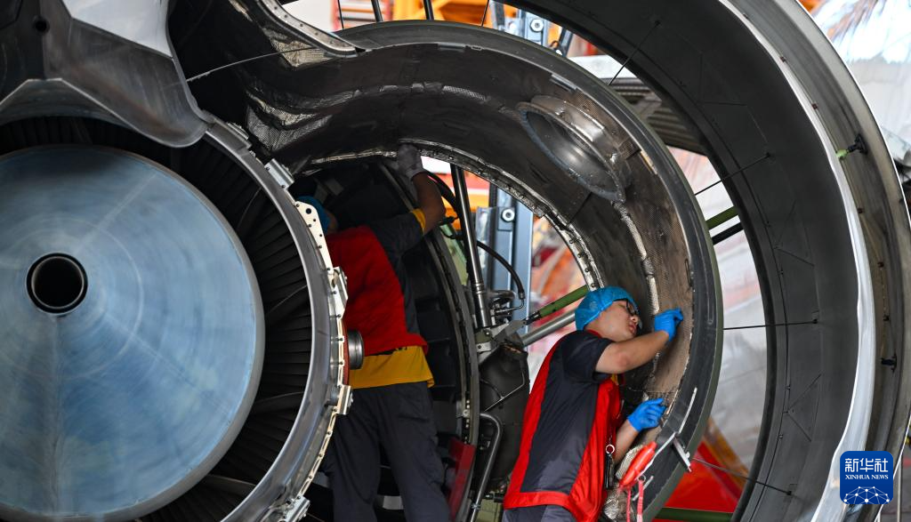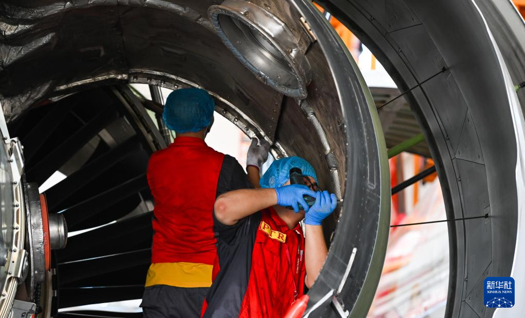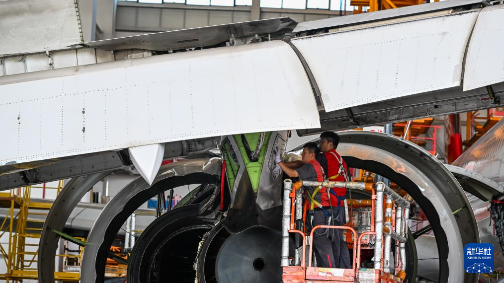 工作人员在海南自贸港一站式飞机维修产业基地检修飞机(9月23日摄)。新华社记者 杨冠宇 摄