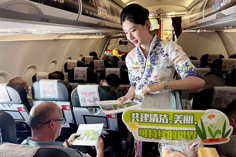 今年6月,北部湾航空携手南宁市生态环境局在南宁-济宁GX8959航班上共同开展“美丽南宁·共建共享”主题航班活动,通过介绍今年六五环境日主题、发放生态环境宣传资料、开展知识互动问答等形式向旅客普及环保知识,让环保知识和城市生态成果以客舱为媒介,走进旅客心中。