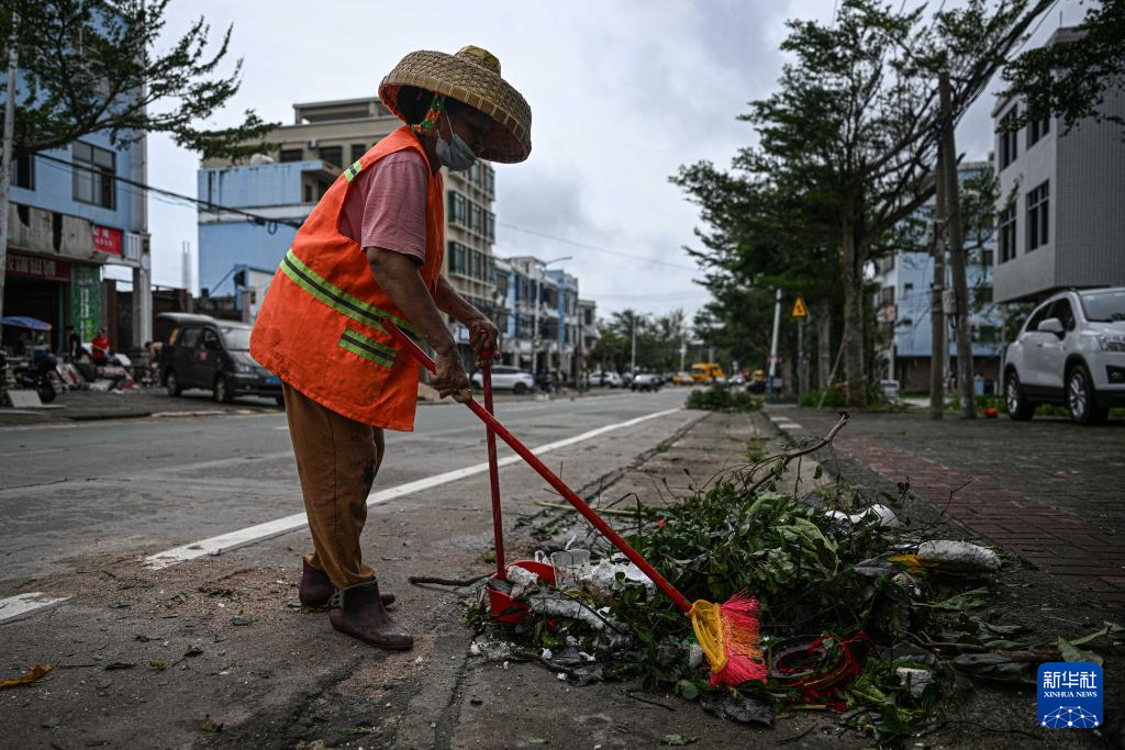10月6日,环卫工人在海南文昌街头清理被台风吹断的树枝等杂物。新华社记者 蒲晓旭 摄