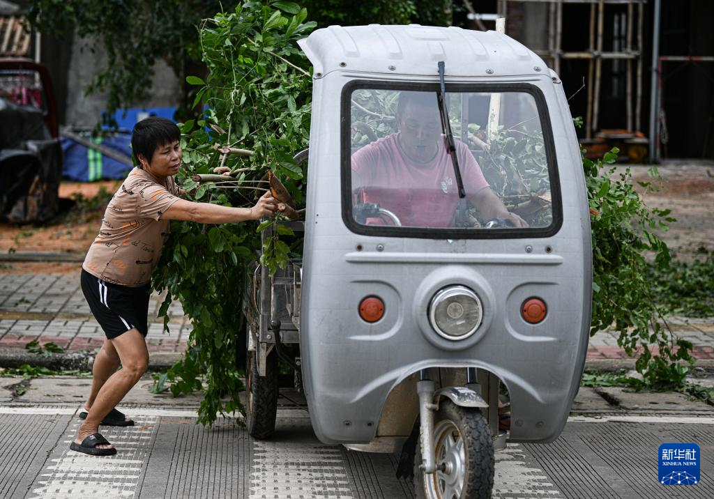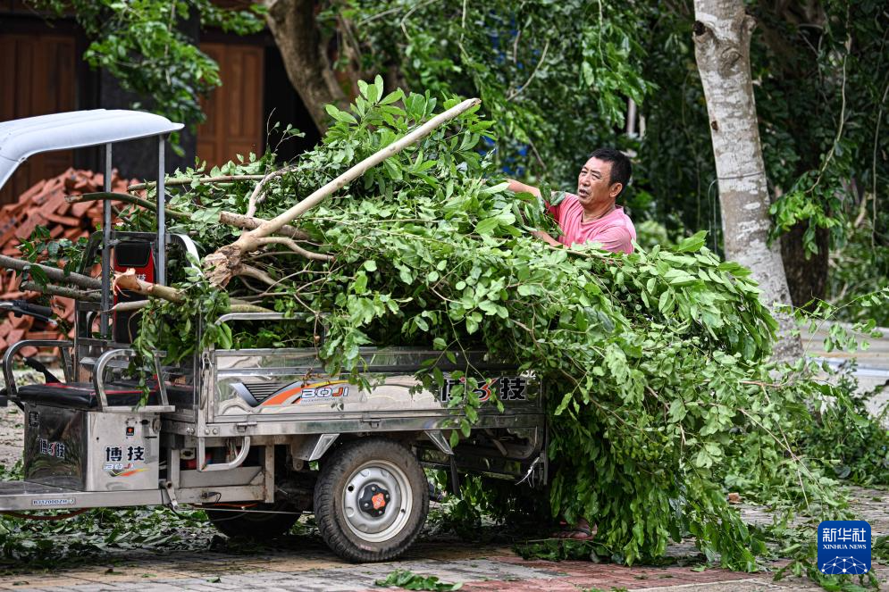 10月6日,在海南文昌,居民将自家门前被台风吹断的树枝装车、转运。新华社记者 蒲晓旭 摄