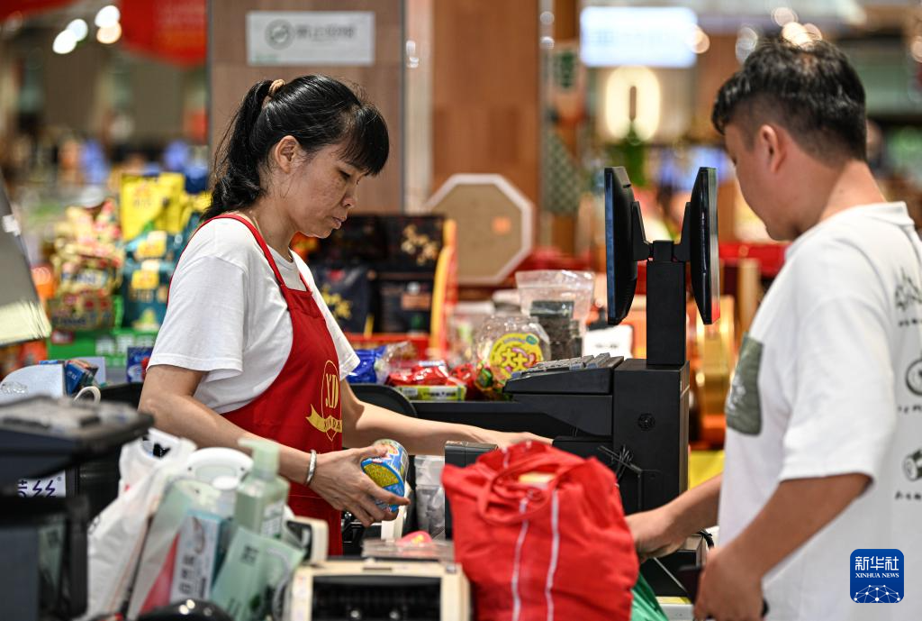 10月6日,在海南文昌一家超市,工作人员为顾客结算商品。新华社记者 蒲晓旭 摄