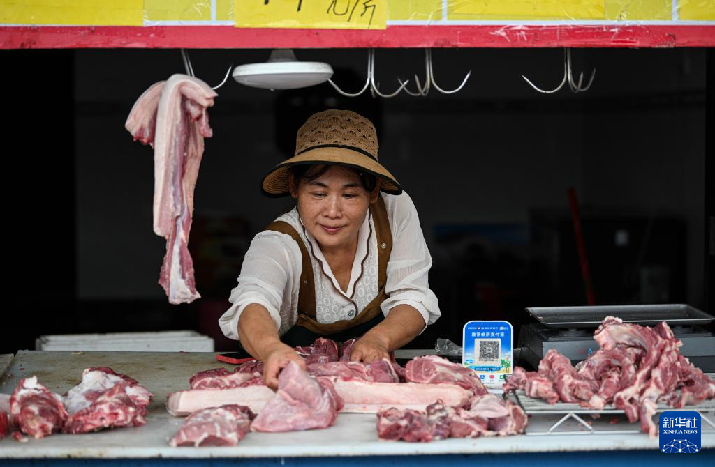 10月6日,在海南文昌一家集贸市场,恢复营业的肉铺老板在打理猪肉。