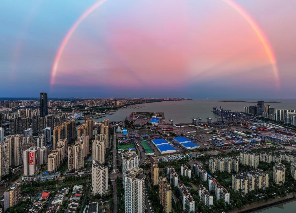 10月6日清晨拍摄的海口市上空的彩虹。新华社发(蒋聚荣摄)