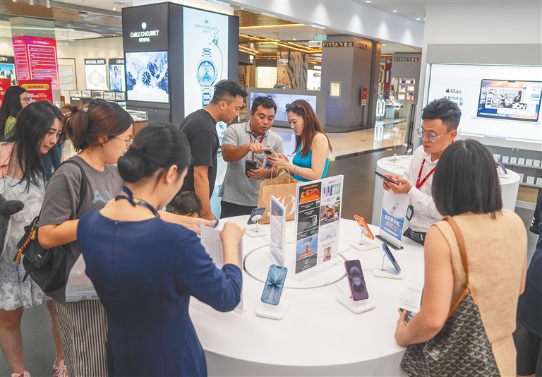 10月8日,在海口日月广场的海控全球精品免税城,不少消费者选购免税品。今年国庆中秋假期,海南离岛免税经营主体通过拓宽消费场景、推出促销活动等方式,持续释放消费活力。海南日报全媒体记者 李天平 摄
