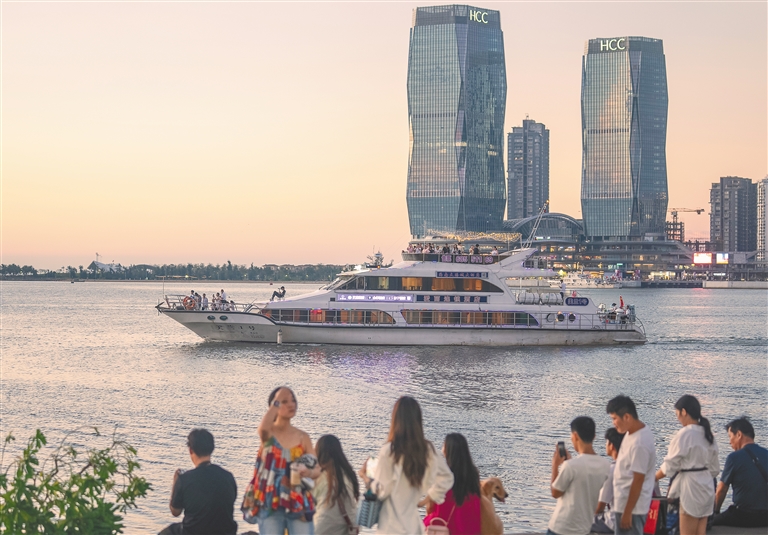 10月8日,市民游客在海口湾遇见一场日落与霞光的完美“接力”,还有不少游客选择乘坐游船观赏美景。海南日报全媒体记者 李天平 摄