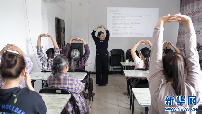 方碧梅在七叉镇重合村教村民养生操。新华网发