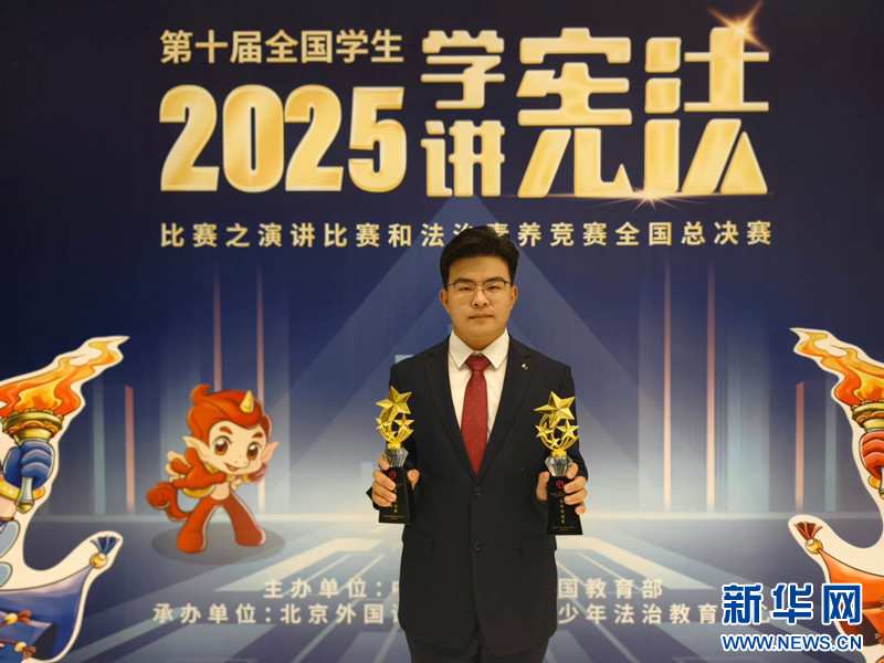 海南大学法学院、椰风书院2024级国际法专业本科生崔子恒荣获全国高校组冠军、最佳表达奖。新华网发