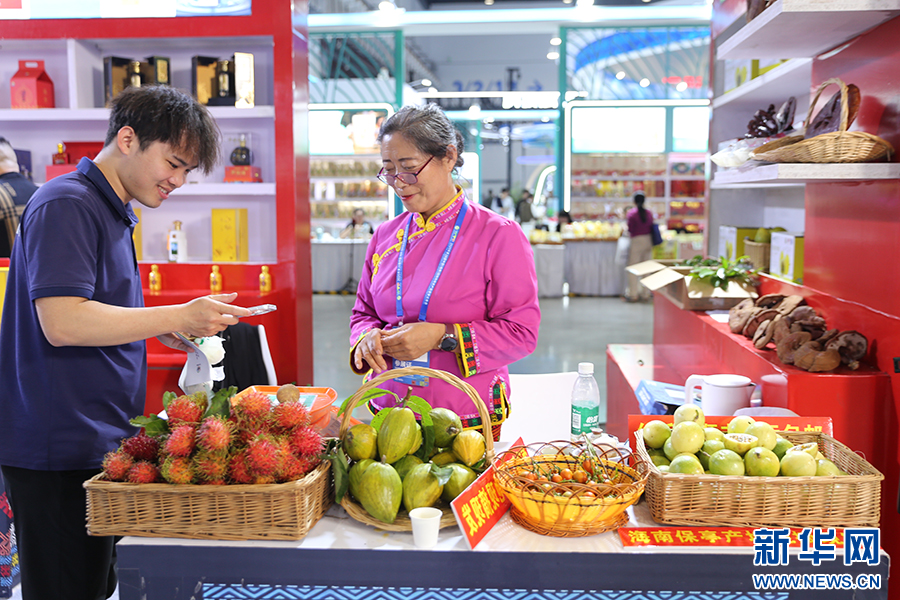 观众在保亭展馆购买特色水果。新华网 王雯君 摄
