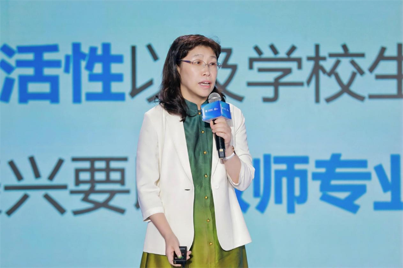 杭州学军中学校长方润根在大会现场分享观点。新华网发