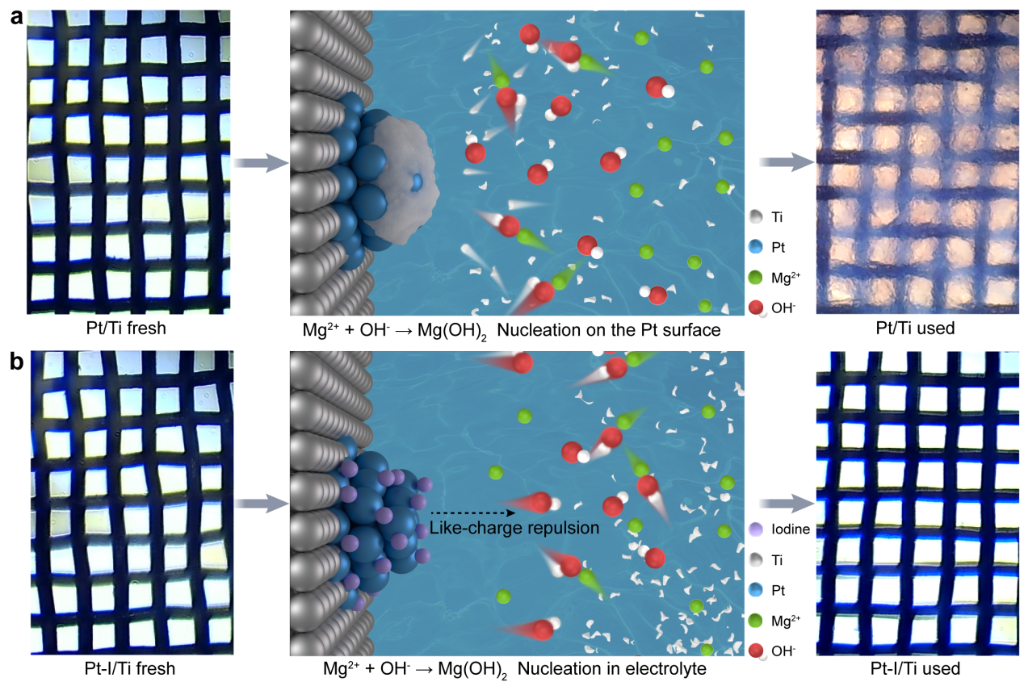 当前,电解淡水制氢成本高、资源消耗大。海水是理想的制氢原料,但其中富含的镁离子在电解过程中易在电极表面沉积,导致电极快速失效。